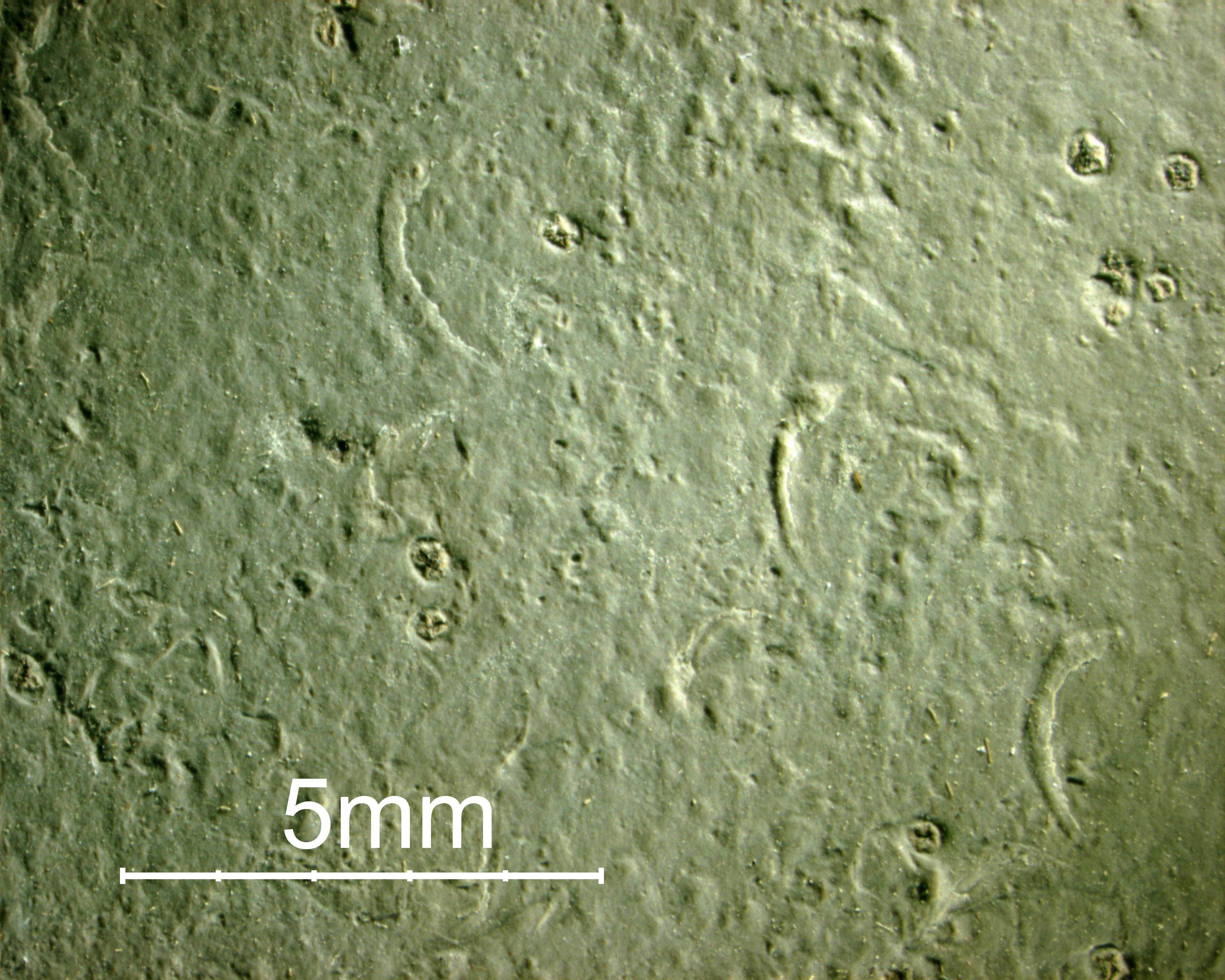 DESCRIPTION: Trail of paired, arcuate impressions, directed outward from center; small central gap between impressions.